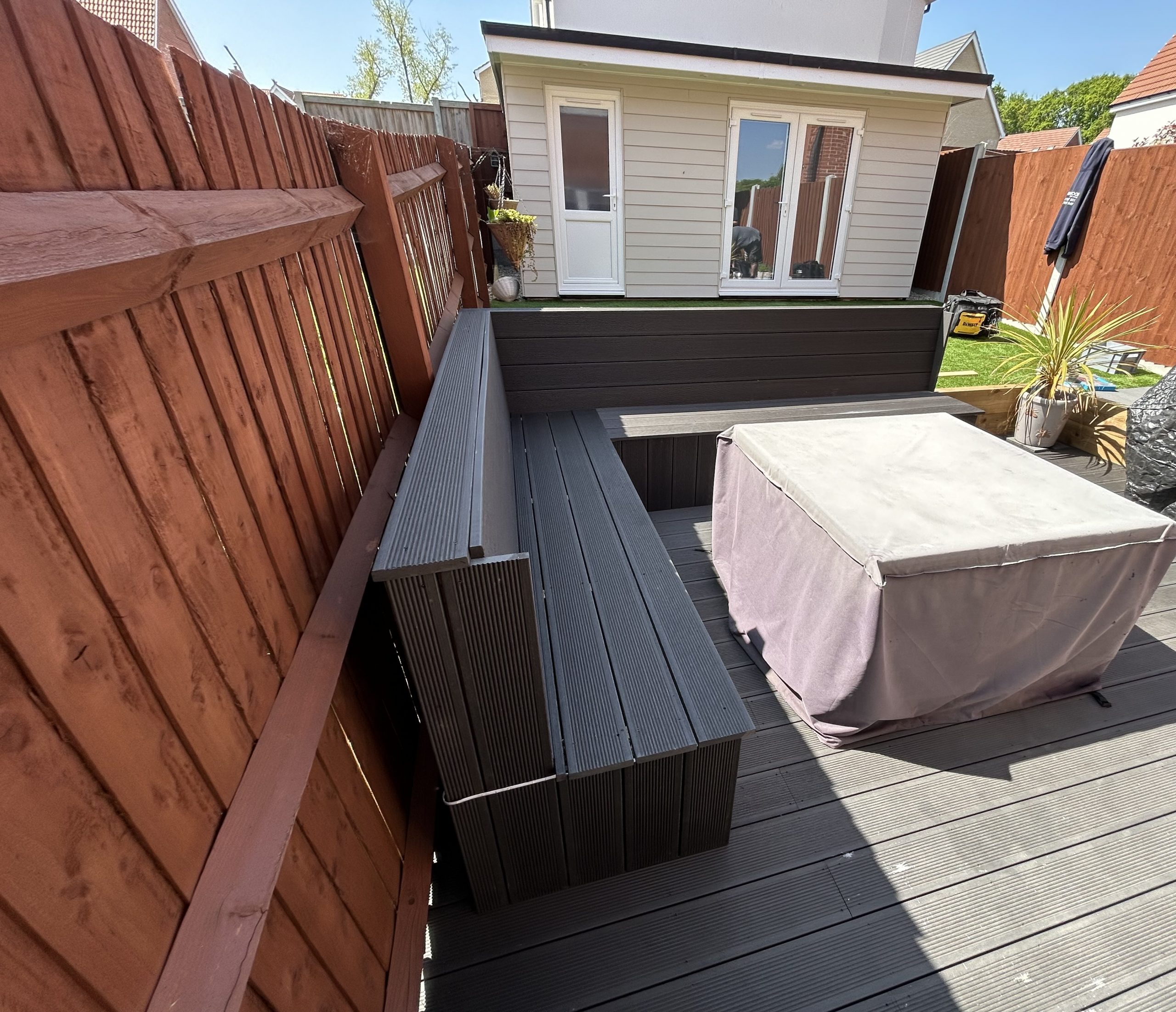 Composite Decking install in family garden. Composite deck is always our recommendation as they are built to last - no splinters, no rot, and super low maintenance